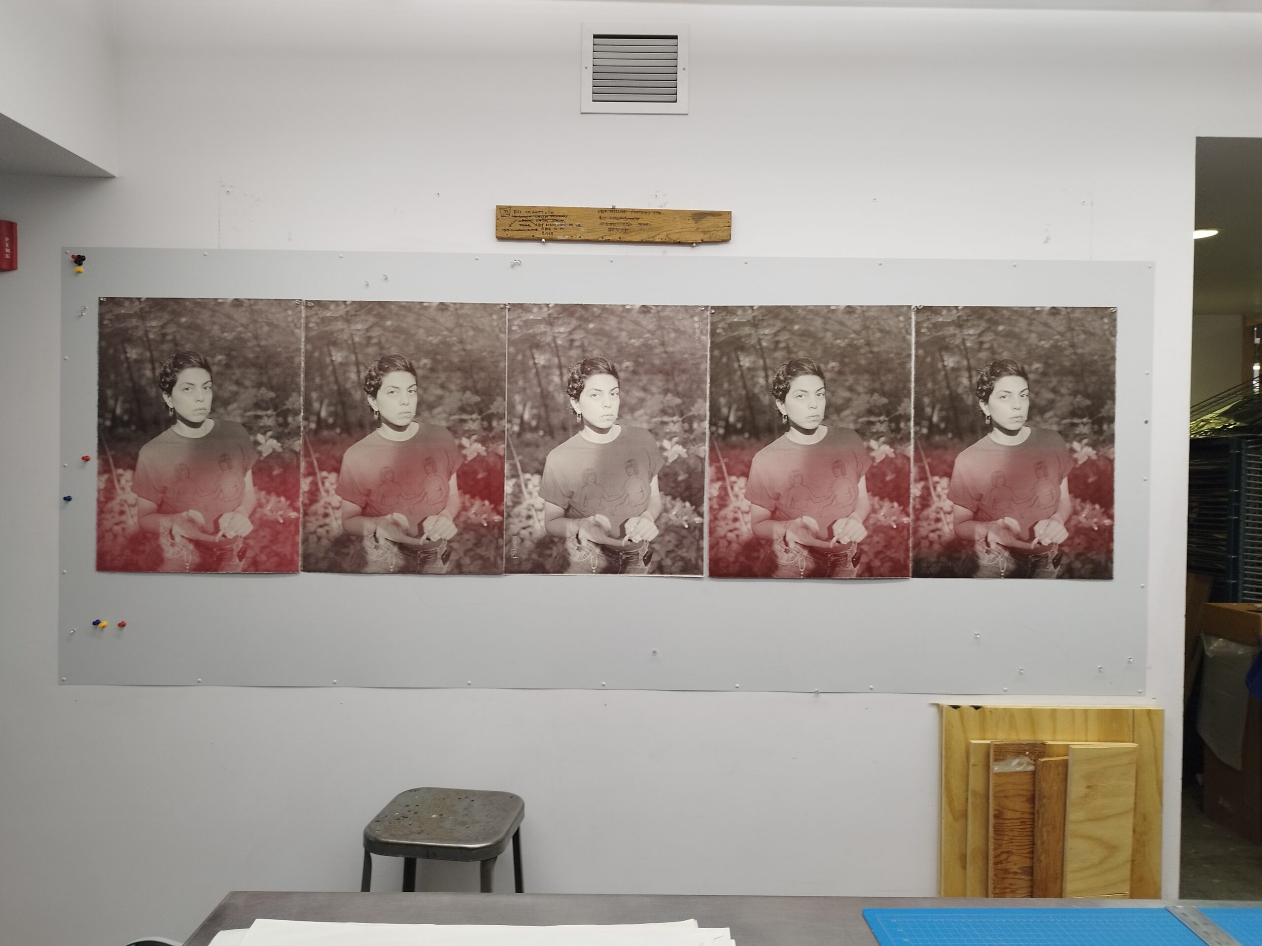 El trabajo de Abbaspour se desarrolla en su mayoría en blanco y negro, por lo que, en un principio se pensó realizar una pieza monocolor, probando con rojos burdeos y con negros rojizos. A través de las diferentes pruebas el color se reveló como una herramienta para resaltar y enfatizar la imagen. El color gris del papel BFK Rives recoge la imagen aportando consistencia y el degradado hacia un rojo focaliza la atención hacia el gesto de las manos que la mujer hace mientras desafiante mira a la cámara.