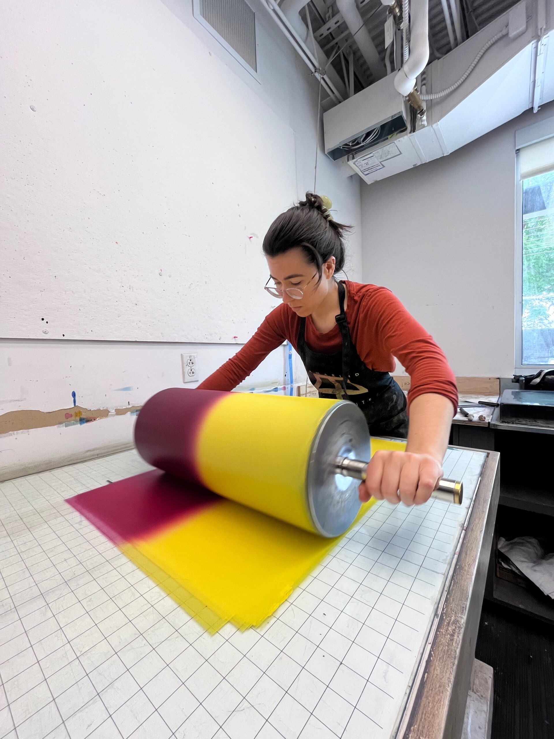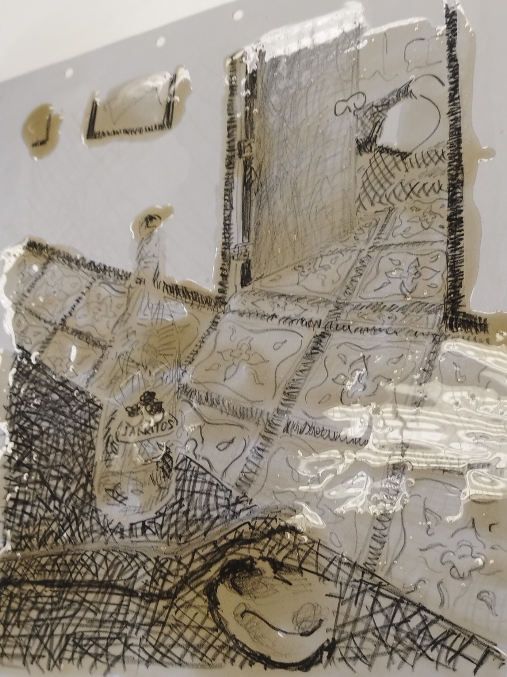 En esta colaboración titulada -La Juerga-, Saúl investiga la creación figurativa a través de un dibujo expresivo usando lápices, tusche y barras litográficas. Un degradado en diagonal crea -espacio- en la obra, donde se juntan y superponen los colores hechos con la frescura de un dibujo intuitivo y corporal reflejando vibración y jolgorio.